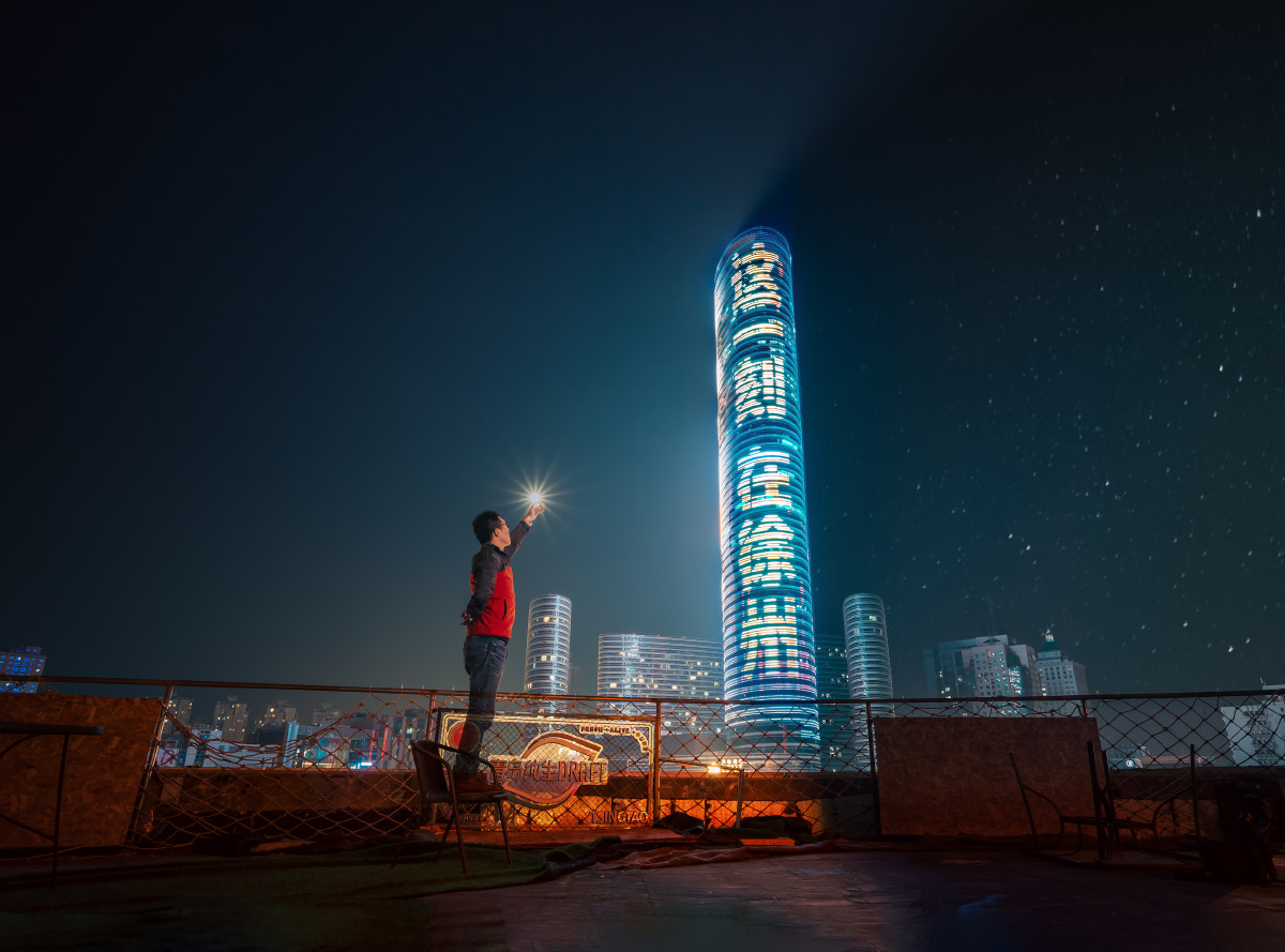 手电筒对上苏宁大楼的瞬间,好像握住了整座城的浪漫开关